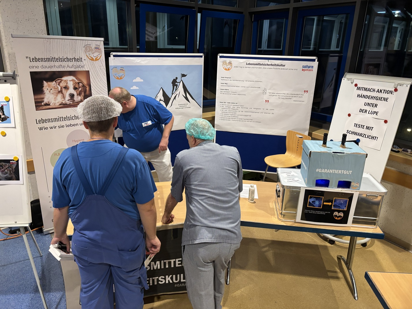 In the company restaurant, five stations illustrated how quality permeates all areas of the business – from goods receipt to the finished can. To reach as many employees as possible, the stations were designed to be varied and interactive. For example, a "spot the difference" puzzle about foreign objects encouraged close observation, and the trainees presented their own station on "Quality in Everyday Life." Another station showcased the various raw materials and their specific characteristics. The station on food safety culture was particularly impressive: under black light, participants could check how thoroughly they had actually cleaned their hands. This clearly demonstrated the importance of proper hand hygiene.